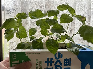 「我が家の子」 この夏は、水耕栽培が流行りとかで、我が家でもキッチンの窓辺で牛乳パックを使って紫蘇の葉を育てた。う〜ん、テレビで見たようにモッサリとは茂らないなぁ・・でも、これが我が家の子たち。愛おしい。 |
