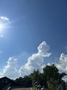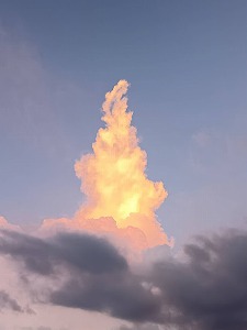 「かなとこ雲」 出かけ先で珍しい雲を見つけました。積乱雲が限界まで発達し、激しい雷雨をもたらす危険な雲なのだとか。この雲の真下では、周囲が真っ暗になるほどの激しい雷雨に見舞われてしまうそうです。しかし、その黒雲を突き破るとこんな素晴らしい見事な青空。地上の苦しみ、でも見えないその上に光があるのですね。 |