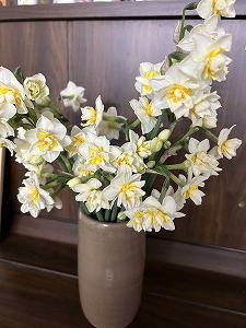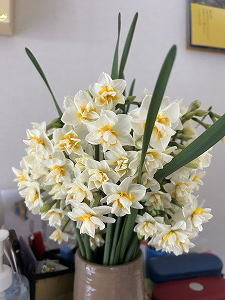 「贅沢な花束」 茎折れ水仙をレスキューし続け、その度に玄関の花瓶に挿して行ったら、いつのまにかこんなに。贅沢な水仙の花束だぁ。良い香りにしばし立ち止まる人続出。ありがたい冬のプレゼントだなぁ。 |