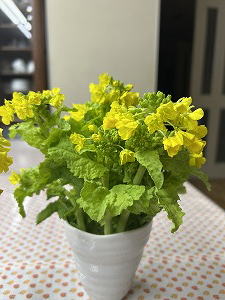 「菜の花レシピ」 食用の菜の花を数本、食べないで我慢して花瓶に入れておくと、ほら、こんなに綺麗に咲いてくれる。我慢した甲斐があったぁ〜と思わせてくれる。明るい緑みの黄色に、うっとりと見入ってしまう。 |
