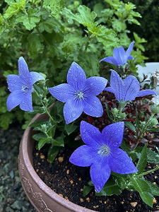 「桔梗」 早朝の雨を楽しむかのように咲き出した桔梗。秋を感じるにはまだ程遠い気候だけど、それでも次の季節が来ることを私たちに教えてくれる。「秋の七草」の立ち位置を背負いながら、静かに語りかけてくれる。 |