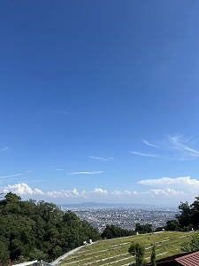 「空は何色?」 夏空の突き抜けるような青さにしばし見惚れる。この青は何色だろう。瑠璃紺(るりこん)?サルビアブルー?セルリアンブルー?「青色」の名前の多さに圧倒されながら、眼下に広がる街を明るく包み込む「今日の空色」に感謝する。 |
