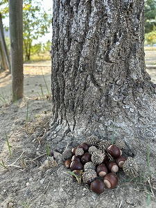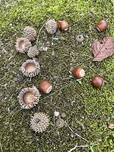 「天の父が養う」 里山の川辺、どんぐりが沢山落ちている!そう思って足元を見ると、いくら探しても実が見当たりません。あるのは抜け殻、ハカマだけです。きっと、小さな可愛い獣たちがこっそり食べてしまったのでしょう。彼らには天の父が用意されたこの季節の最高のグルメ。 |