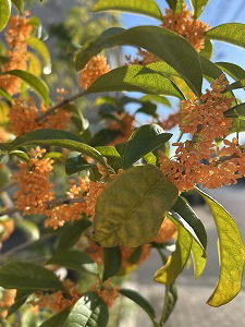 「どこからともなく」 あれ?いい香り。どこから香るのか思わず探してしまう。この時期のお楽しみクイズ。おお、ここかぁ。オレンジ色の小さなブーケがいっぱい。金木犀(きんもくせい)を探し当てられると、ちょっと得した気持ちになるね。今日も「一金貨ゲットだぜ」の気分。 |
