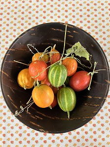 「カラフル」 こんなにもバラエティーに富んだ烏瓜(からすうり)。秋の宝石だね。猪の子どもを「うりぼう」と呼ぶのをふと思い出す、この縞々模様。クリスマスリースを作っていただくために、全部、里子に出しました。 |
