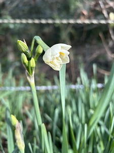「一番乗り」 駐車場の水仙の花が蕾をもち始めました。今年も良い香りで、たくさん私たちを楽しませてくれることでしょう。楽しみだなぁ〜と思っていたら、今朝、ゴミ出しに行った帰りに、一番乗りの子を発見!「ようこそ!!」 |