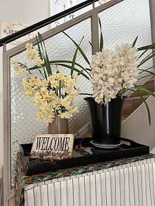 「玄関先のツートップ」 宝塚のトップスターのように華やかさを誇る二人。胡蝶蘭風に花を垂らすように枝を矯正したシンビジュウム。このような形のものは珍しいのだとか(お隣の師匠談)。玄関先が一気に晴れ舞台となる。もう3月だぁ。 |