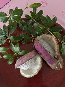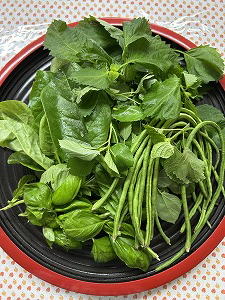 「我慢できない」 芋は芋でもこちらはジャガイモ。庭で採れた野菜をこんなに沢山いただいた。夕飯まで待てずに、さっそく蒸かしておやつにいただく。ホクホクの甘み。う〜ん、夏の大地からの恵味(めぐみ)だなぁ。ごちそうさまでした。 |