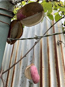 「知らない間に」 こんなところにアケビの実。教会の駐車場の片隅で実をつけていた。熟して白い果肉をパックリと開いてくれたので気がついたけど、ひっそりと垂れ下がって静かに身を隠す、自然界の忍者だなぁ。 |