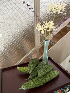 「10月だけど・・」 暦の上の「衣替え」の季節。とはいえ、まだまだ半袖が手放せない日々。でも夏から秋へと少しずつバトンタッチされているのを感じる。夏のゴーヤと、白い曼珠沙華、紫式部の実が玄関先で一緒に歓談。 |