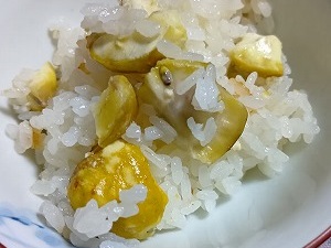 「秋の味覚」 頂いた栗でご飯を炊きました。これぞ「秋の味覚!」季節を支配し、秋の実りをくださった神さま、そして栗をくださった愛に感謝し、噛みしめつつ、おいしく頂きました。 |