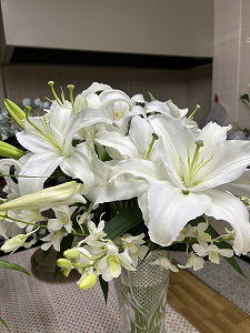 | 「花に華」 毎週、教会の姉妹方が交代で講壇の花を生けてくださる。「今日は○○さん?」知らず知らずのうちに、その人らしさが花の生け方にも出る。冬場は花が保つので「先週のお花また使わせてもらっちゃったわ」「あら嬉しいありがとう」この仲の良さも、美しさに華を添えている。 |