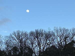 「真昼の月」 教会に帰る途中で見つけた、青空の中にぽっかりと浮かぶ白い月の姿。「昼でも月が見えるんですねぇ」今日は風がちょっと強めで空気が澄んでいるから、こんなにくっきりと。神さまからのご褒美だなぁ。「帰ったら温かい紅茶を飲もうね」とトラクト配布の帰り道。 |