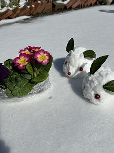 「雪遊びPart.2」 楽しくって、雪遊びが止まらない。雪だるまの友達「雪うさぎ」のカップルも制作。教会で「ねぇ見て見て」と写真を見せては自慢する私に「次回は私も誘ってねぇ」という優しい仲間たち。うん、誘うねぇ〜。 |