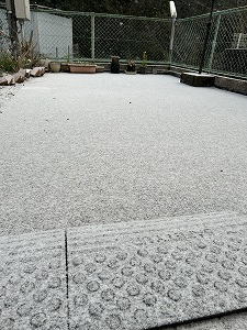 「あら、雪」 玄関先に出てびっくり。知らない間に雪がうっすらと降り積もっていました。部屋の中に居たけど、音がしないので気が付きませんでした。「ちらちらと」という言葉がピッタリ。可憐に舞うように降る雪。う〜ん、この量だと雪だるまを作るには無理かなぁ〜。 |