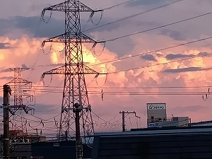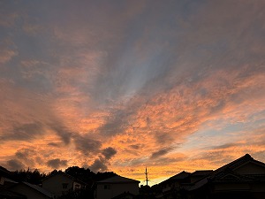 「夕焼け雲」 普通「夕焼け」は明日の穏やかな晴天を約束する平和な景色と思っていましたが、最近見たこの雲たちは激しく荒々しい気象変化を想起させます。「空模様を見分けることを知っていながら、時のしるしを見分けることはできないのですか。」とのイエス様のお言葉を思い出しました。 |