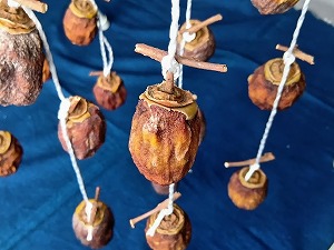 「干し柿」 柿に含まれる渋みのタンニンが水溶性なら渋柿で、不溶性なら(舌が感じないので)甘い柿だそうです。リンゴと一緒に保存したり、アルコール処理をしたり、干し柿にすると甘くなるとのこと。不思議な自然界の法則=神さまの深い配慮=はこんな身近なところにもありました!!! |