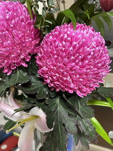 「訂正」 前回、芍薬(Peony)と紹介した花の写真を載せたところ「違うわよぉ」との声が多数寄せられ。よく見たら、確かに葉っぱが紛れもない菊の葉でした。「ピオニーマム(ピオニー菊)」だそう。「芍薬」の名を与えられた「菊」・・「猿」と呼ばれた「秀吉」みたいなもんかなぁ。 |